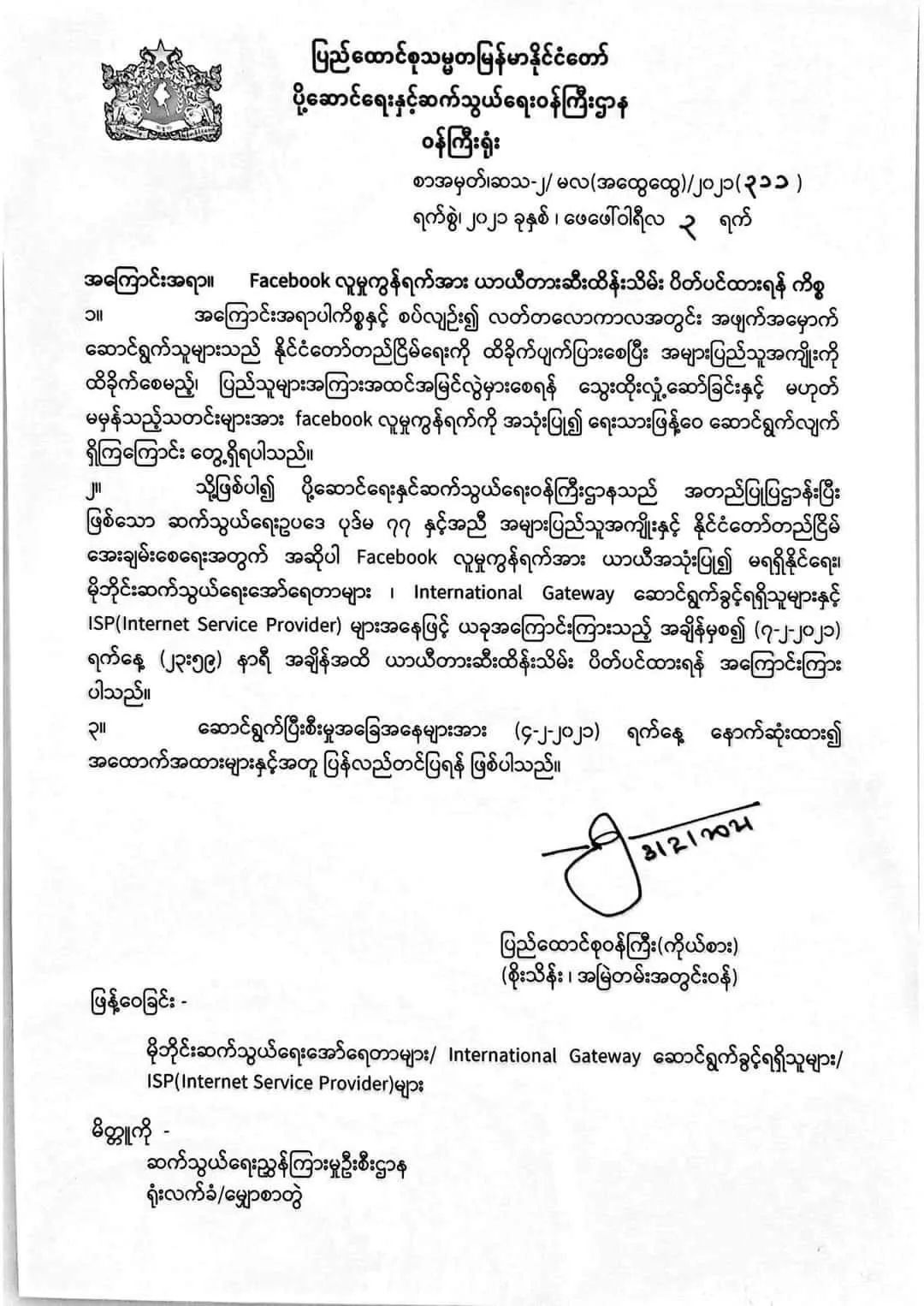 據報道,緬甸政府在臨時禁令中表示,鑑於有人在Facebook上散布虛假消息,破壞緬甸局勢穩定,為了維護社會安全而頒布了該禁令。根據緬甸國內電信相關法規,緬甸政府可在「為了維護公眾利益」時實施電信管制。對此,Facebook公司發言人呼籲緬甸政府「恢復Facebook在當地的運營」。
