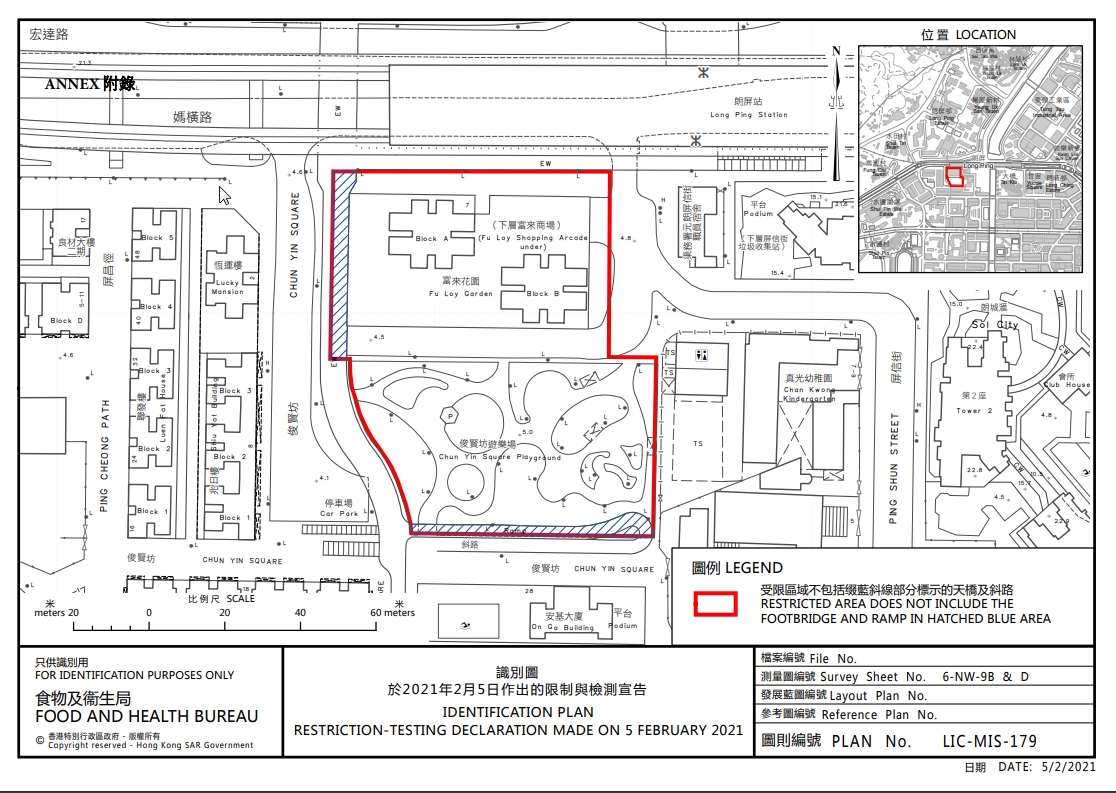 政府今晚19:04宣布引用《預防及控制疾病(對若干人士強制檢測)規例》(第599J章),作出限制與檢測宣告,要求自下午7時起限制在元朗媽橫路7號富來花園內的人士須留在其處所並接受強制檢測。