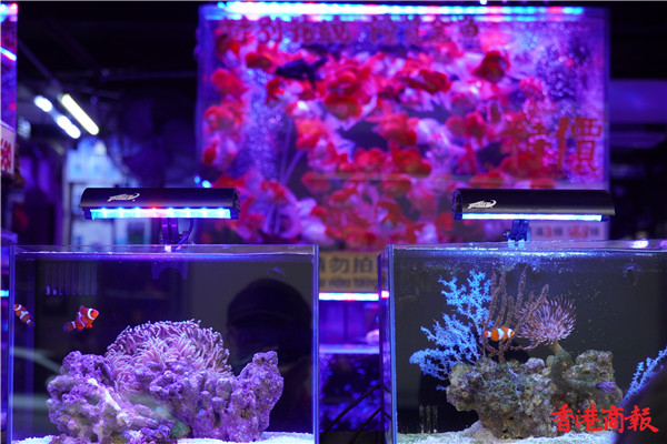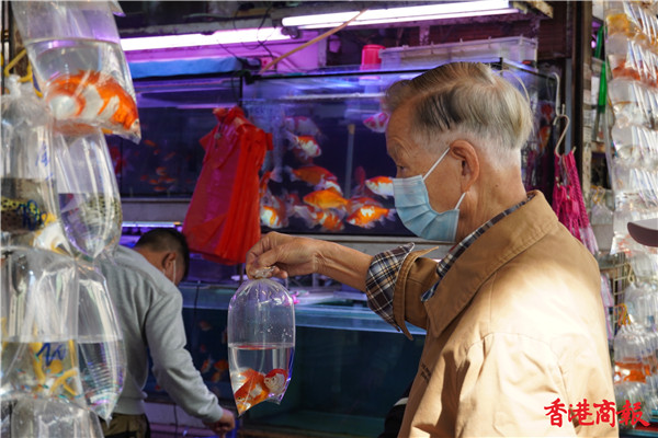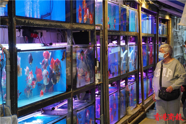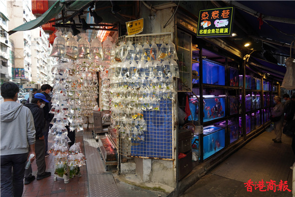 位於油尖旺區通菜街,俗稱「金魚街」的金魚市場,令人有恍如置身水族館感覺。該區開設了超過四十間,專門售賣金魚及養殖觀賞魚的水族用品專門店,吸引很多對養魚感興趣的市民到訪和購物。整條金魚街的店舖都擺放了令人目不暇給、色彩繽紛的魚,在這裏漫步實在是賞心悅目的樂事。(馮俊文攝)
