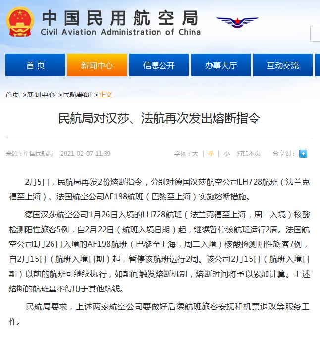 據中國民航局網站今日消息,2月5日,民航局再發2份熔斷指令,分別對德國漢莎航空公司LH728航班(法蘭克福至上海)、法國航空公司AF198航班(巴黎至上海)實施熔斷措施。