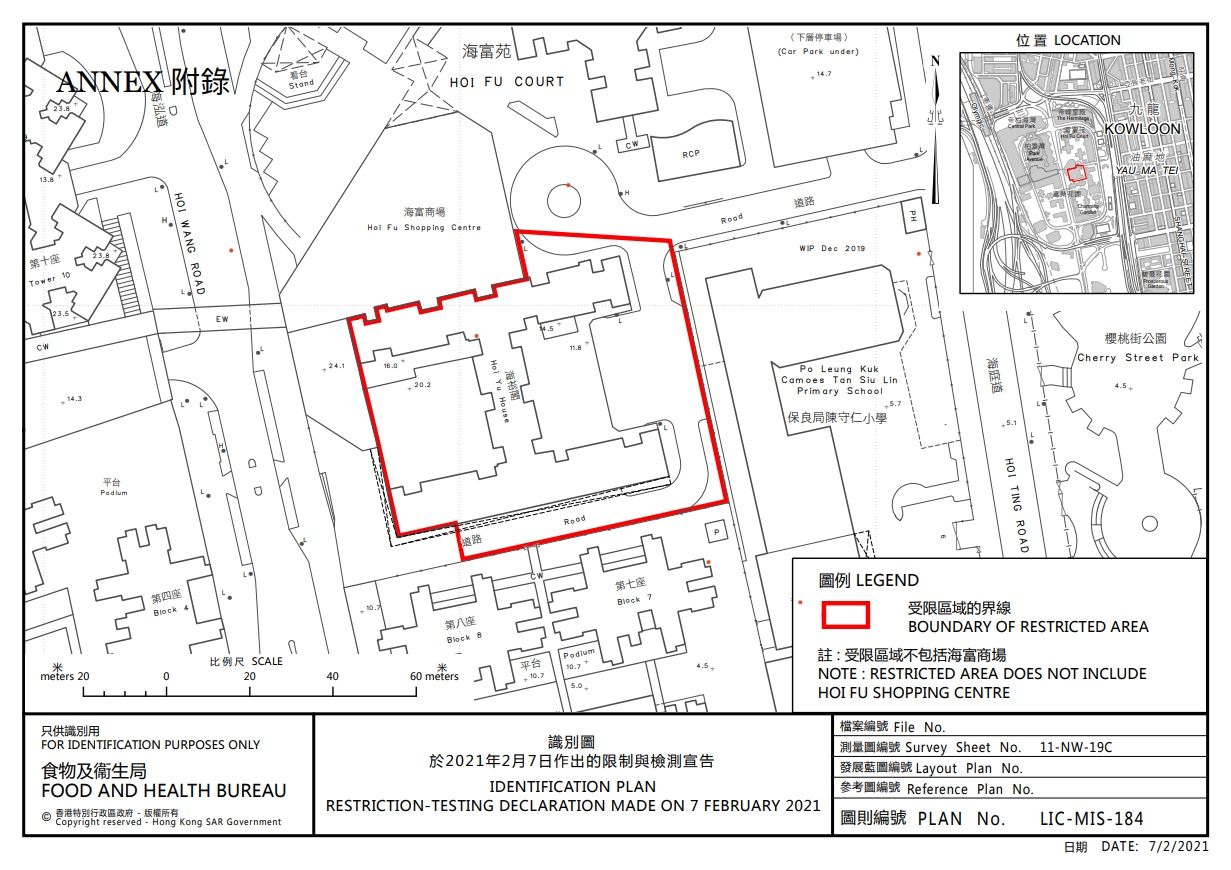 政府7日晚7時宣布引用《預防及控制疾病(對若干人士強制檢測)規例》(第599J章)作出限制與檢測宣告,自下午7時起限制在旺角海庭道2號海富苑海裕閣(不包括海富商場)內的人士須留在其處所並接受強制檢測。受檢人士須在其處所等候,直至區內所有已識別的受檢人士完成檢測,而相關檢測結果亦已獲大致確定,方可離開其處所。政府目標是在8日早約7時左右完成此行動。