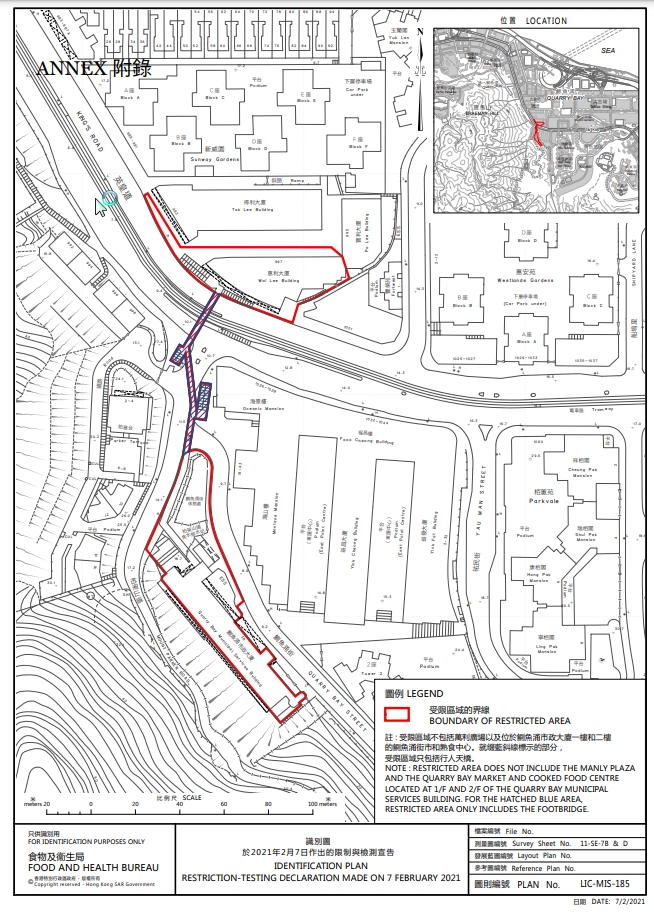 政府7日晚7时30分再宣布,自下午19:30分起限制在鰂魚涌英皇道997號惠利大廈(不包括萬利廣場)內的人士須留在其處所並接受強制檢測。行動預計在8日早7時完成。