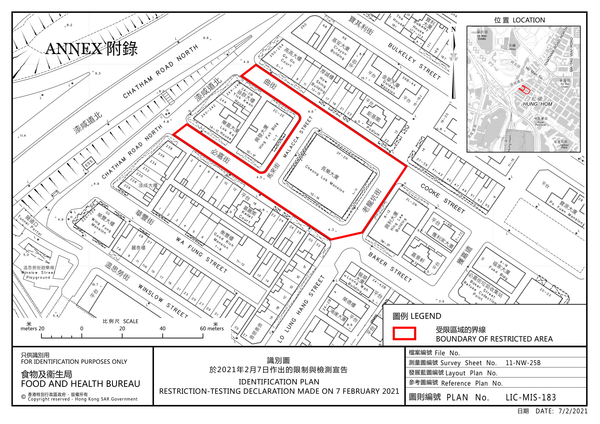 政府在7日晚上8時再宣布,自下午8時起限制在紅磡必嘉街1G-1K號長樂大廈內的人士須留在其處所並接受強制檢測。行動預計在明日(8日)上午約6時30分左右完成。