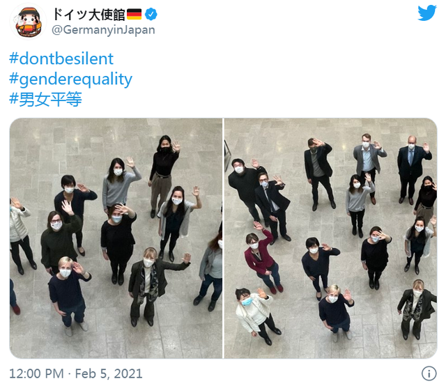 德國駐日本大使館2月5日發表的推文。據日本時事通訊社2月6日報道,這場運動由德國駐日使館發起。德國大使館5日發布了兩張照片,配有英文的「不要沉默」「性別平等」和日文的「男女平等」標籤,該推文截至7日點讚數已超過4.7萬,轉發量超過1.8萬。芬蘭、瑞典、愛爾蘭、葡萄牙和西班牙等國的駐日使館以及東京聯合國信息中心也加入了這一行動,在推特上發布了類似照片。據日媒報道,雖然這些推文沒有直接提及事由,但很可能是在回應森喜朗此前歧視女性、含有性別刻板印象的言論。