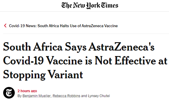 據《紐約時報》周日報道指出,這是因為該疫苗對南非變異新冠病毒造成的輕度至中度感染的保護作用微乎其微,不能有效保護南非臨床試驗受試者。這與阿斯利康最新在《柳葉刀》上傳的預印本文章數據相矛盾。因此,南非政府決定暫停在本國的疫苗接種工作中使用阿斯利康疫苗。