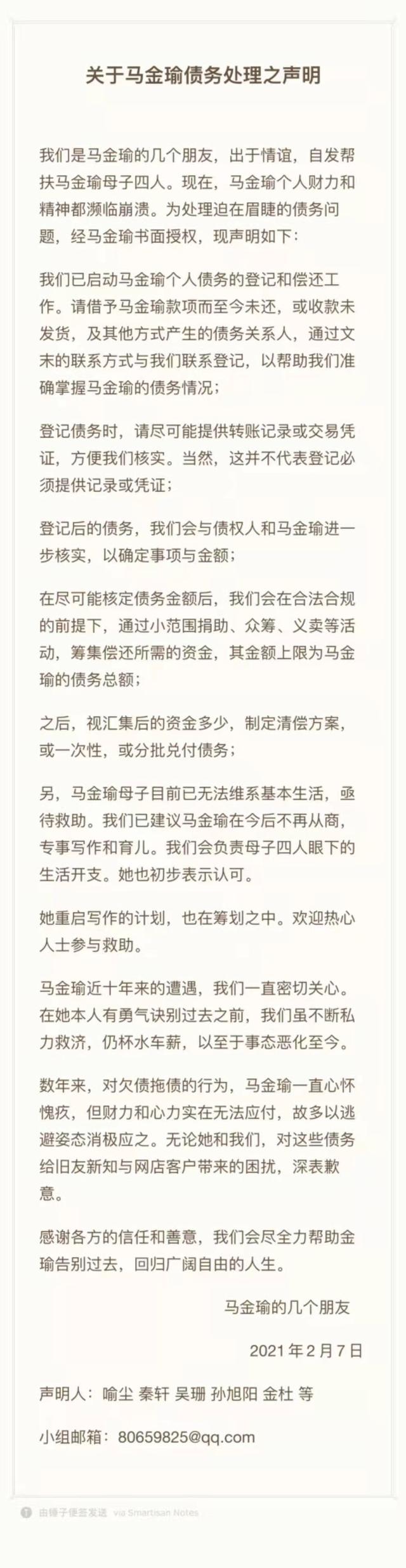 2月7日下午,一份《馬金瑜債務處理之聲明》在網絡流傳。發布人自稱是馬金瑜的朋友,經馬金瑜的書面授權,對其債務問題作出聲明。他們此次發《聲明》的目的之一也是想先把馬金瑜之前的債務理清。他們還提到了馬金瑜的近況,希望熱心人士參與救助。