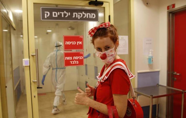 以色列醫院裏的「醫療小丑」穿着一身滑稽裝扮,佩戴涂鴉口罩,動作夸張,希望以此帮助患者在歡笑中配合治療,並暫時忘卻孤獨和痛苦。新華社