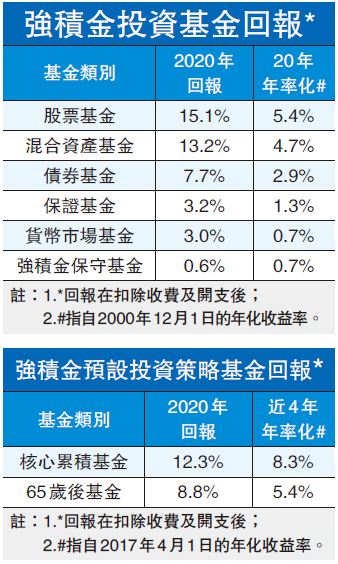 至於具備隨年齡降險、分散投資環球市場和設有收費上限3大特點的預設投資策略,當中的核心累積基金及65歲後基金2020年整體回報分別為12.3%及8.8%。