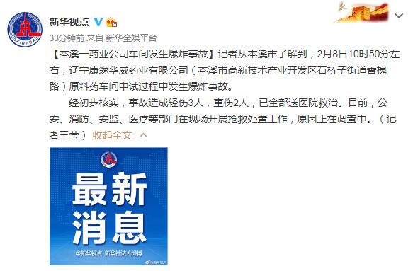 據悉,2月8日10時50分左右,遼寧康緣華威藥業有限公司(本溪市高新技術產業開發區石橋子街道香槐路)原料藥車間中試過程中發生爆炸事故。
