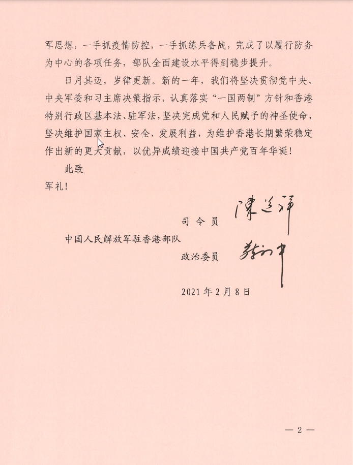 過去的一年,香港國安法頒布實施,特區政府和愛國愛港同胞有效致力於社會由亂及治。各界人士以多種形式紀念香港基本法頒布30周年,全面準確貫徹實施「一國兩制」方針和基本法有了更為廣泛的社會共識。面對突如其來的新冠肺炎疫情,香港同胞通過各種方式和渠道向內地捐款捐物,內地核酸檢測支援隊白衣為甲、馳援香江,充分展現了香港同胞與祖國內地守望相助、攜手同心的骨肉深情。廣大市民朋友積極支持駐軍履行使命職責,駐軍官兵對每一位愛國愛港的香港同胞深表感佩,並致以崇高敬意!