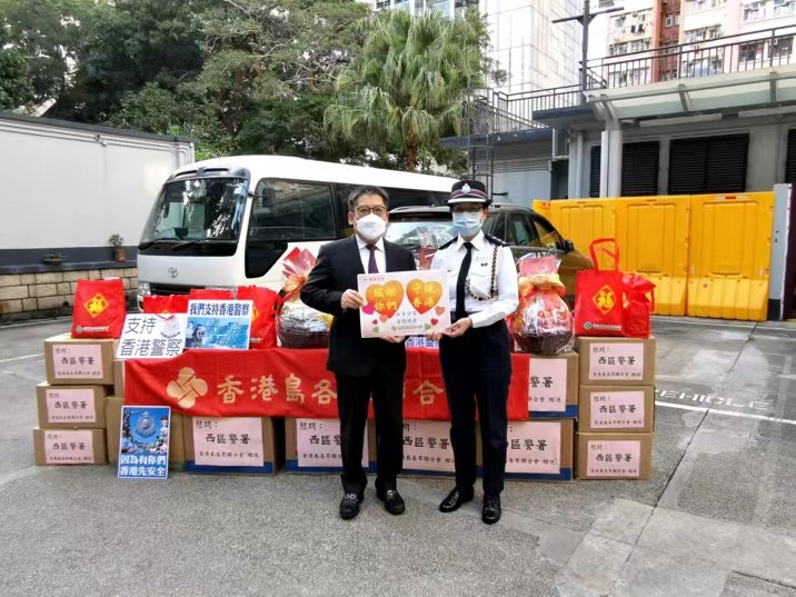 近日,香港島各界聯合會理事長蘇長榮與眾首長分別親身前往香港島各警署慰問各區前線警員,並在節日來臨之際送上市民對警隊的關懷和祝福。參與活動的眾位首長包括:常務副理事長郭二澈、周厚立、莊創業、張雅麗、陳李妮;副理事長區子安、陳南坡、劉慶揚;總幹事徐景勝等等,分別前往中區分區、山頂分區、西區分區、香港仔分區、赤柱分區、灣仔分區、跑馬地分區、北角區分區、柴灣分區、水警南分區、港口分區向在社會運動和疫情工作中勞苦功高的香港警察表達敬意,代表香港島各界聯合會200多個團體及18萬會員感謝警察對社會做出的貢獻。慰問活動獲中區警區指揮官林鴻釧、西區警區指揮官黃少卿、灣仔區警區指揮官陳思達、東區警區副指揮官邱倩雯、水警南分區指揮官韋力誠、水警南分區助理指揮官梁瑋賢及余嘉倫代表各警區警務人員接見並接受慰問心意卡及物資。