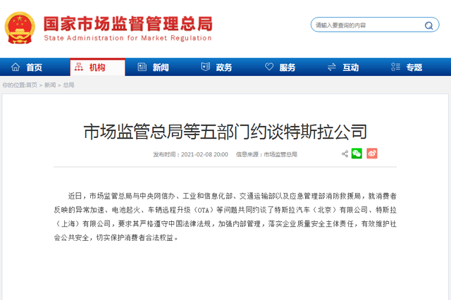 據國家市場監督管理總局網站8日消息,近日,市場監管總局與中央網信辦、工業和信息化部、交通運輸部以及應急管理部消防救援局,就消費者反映的異常加速、電池起火、車輛遠程升級(OTA)等問題共同約談了特斯拉汽車(北京)有限公司、特斯拉(上海)有限公司,要求其嚴格遵守中國法律法規,加強內部管理,落實企業質量安全主體責任,有效維護社會公共安全,切實保護消費者合法權益。