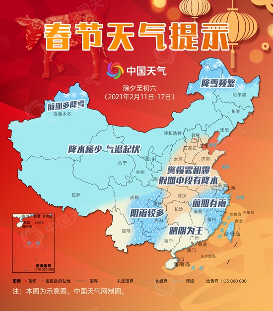 另外需要注意的是,除夕至初四的早晨,河北、河南、山東、安徽、江蘇、湖北、湖南、四川、重慶等地將有大霧,部分地區能見度不足200米。初三至初六,琼州海峽有間歇性大霧,需防範對出行的不利影響。