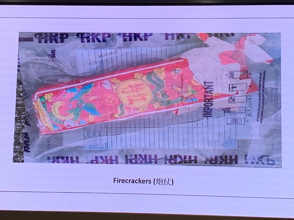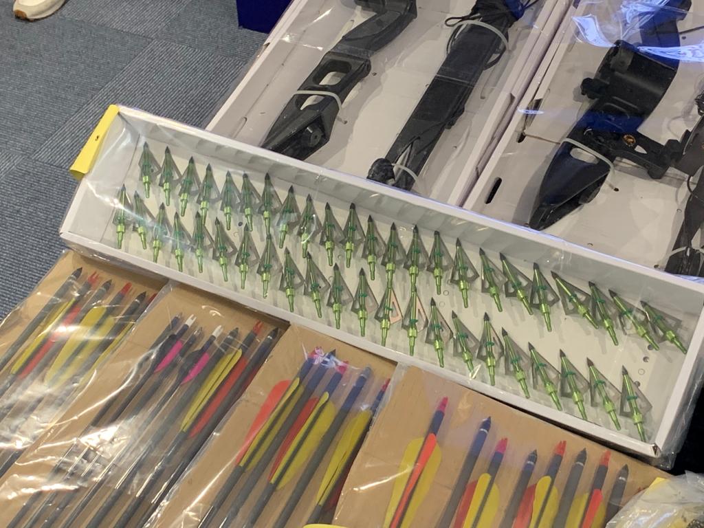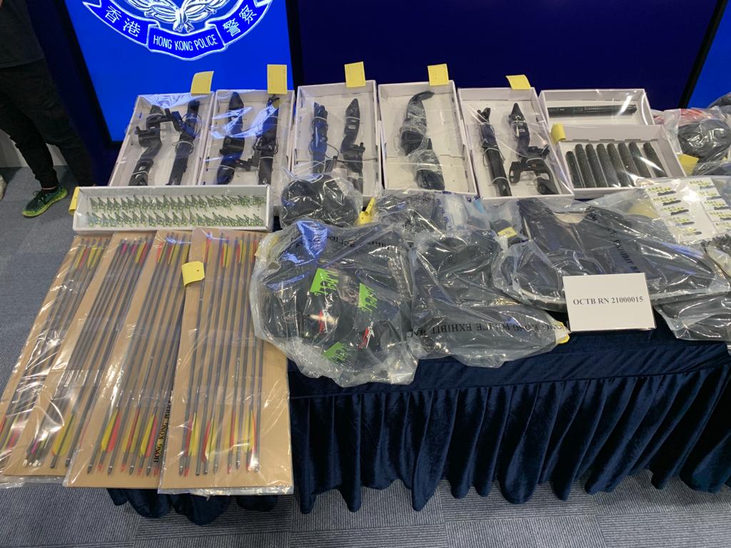 昨日中午時分,探員根據情報到粉嶺埋伏,當時一名42歲男子在粉嶺一單位離開,他手持一個行李喼和一個尼龍袋,探員截查在行李喼中發現23.5公斤可製造爆炸品原料,其中包括硝酸鉀、硫磺、懷疑鎂粉,炮仗和煙花蠟燭,另有3個控制煙花的遙控裝置、電池、2個電子磅、一條USB線。在尼龍袋中搜出多個防毒面具、300個防毒面具濾芯和護甲,馬上將其拘捕。稍後在涉案單位內檢獲大批弓箭、2支懷疑電槍、8支伸縮棍、4部對講機、3部手機和一部平板電腦,以及寫有政治口號的單張、大批護甲,62歲屋主同時被捕。