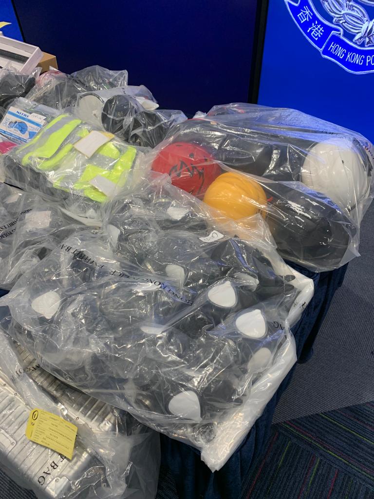 探員其後到柴灣、上環和沙田3處地點,再搜出大批防毒面具、蒙面物品和護甲,該3處地方分別是42歲疑犯提取尼龍袋的地方、工作地點和住址。