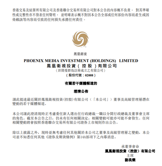 2月10日上午消息,鳳凰衛視(0.65, 0.11, 20.37%)發布公告澄清稱,公司正考慮委任新人選出任行政總裁一職以分開行政總裁及董事會主席的角色。任何相關變動將會按照香港聯合交易所有限公司證券上市規則作出公告。