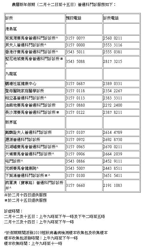 醫院管理局今日(10日)公布,因應新冠肺炎疫情和冬季服務高峰期,會加強普通科門診診所在農曆新年的服務,增加約1200個額外診症名額,另有4間普通科門診診所於假期期間額外增設服務,即合共有17間普通科門診診所提供服務,配合市民的求診需要。