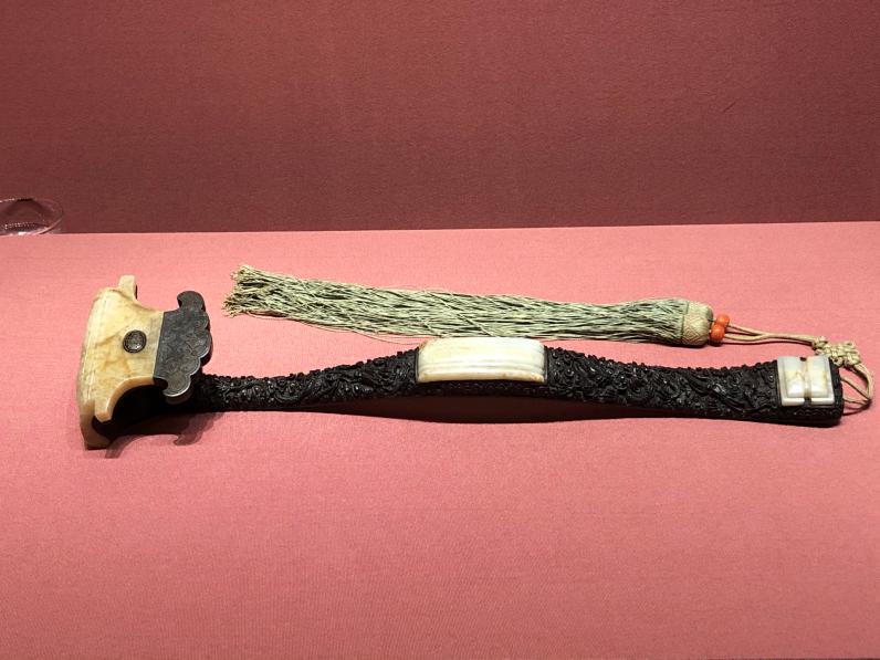 此外,本次展覽中有多件文物格外亮眼。位於展廳二樓的紫檀嵌白玉雲龍紋三鑲如意,在紫檀柄的首、中、尾三處各嵌一塊仿古白玉。這一造型乃乾隆皇帝首創,既包含如意的吉祥寓意,又可用於把玩、欣賞古玉,可謂一舉兩得。乾隆皇帝御製詩《詠漢玉檀柄如意》曰:「漢玉香檀接柄長,兩端仍漢玉為相。居今慕古思恆永,得一含三趣可詳……」由此可見,檀香柄如意鑲嵌三塊古玉形成「得一含三」的三鑲式,深受乾隆皇帝喜愛。