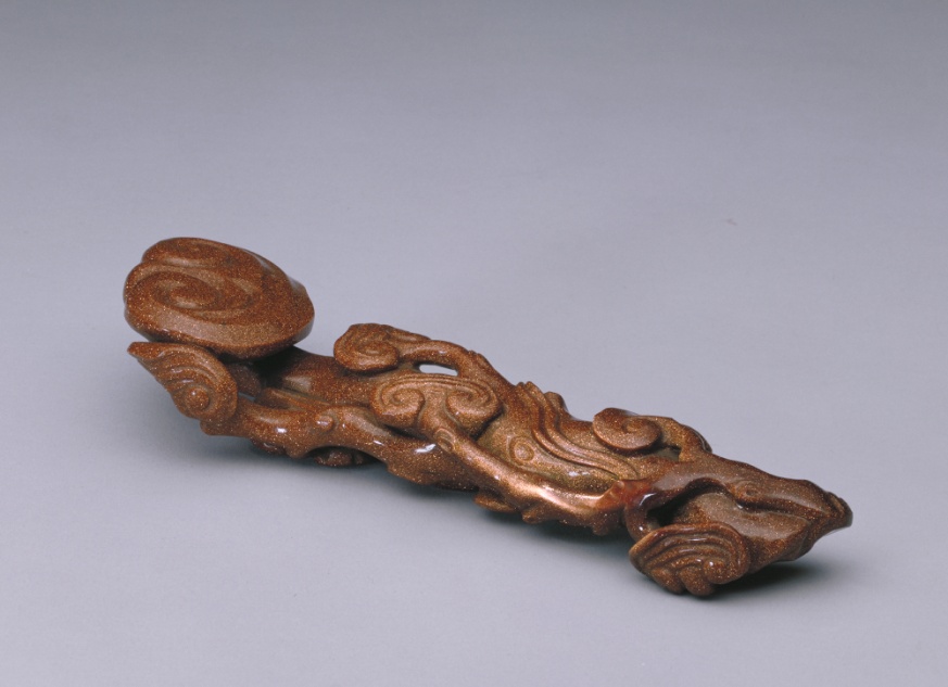 展廳中,一款金星玻璃如意,工藝精湛,造型如雲似芝,頗受關注。這柄如意通體以金星玻璃雕琢成靈芝形,柄首、柄身前後上下共雕刻9棵靈芝,取意「九莖三秀」。據《史記·孝武本紀》記載,出現九莖靈芝相連,乃祥瑞之徵,漢武帝曾為之大赦天下。金星玻璃因在黃褐色玻璃體內蘊含細密且金光閃閃的結晶顆粒而得名。其製造十分不易,往往作為珍貴原料以琢玉的方法雕琢成器。