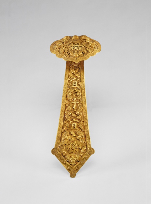 此外,金「宜子宜孫」囍字如意也是亮點之一。帶囍字的如意為婚慶所用。根據清代禮儀,在帝後大婚過程中,皇后乘坐入宮的鳳輿時,要手執蘋果、金質雙喜如意(寓意「平安如意」)。婚後,帝、後覲見母輩太后的朝見禮上,皇后還需首先向太后進呈如意,以示侍奉唯謹;回到乾清宮,皇后需向皇帝呈進如意,皇帝亦回賜皇后如意。可見如意曾出現在清代宮廷婚禮慶典的各個環節,可謂「吉祥先進金如意,天樂聲中降鳳凰」。(香港商報駐京記者 林彬彬)