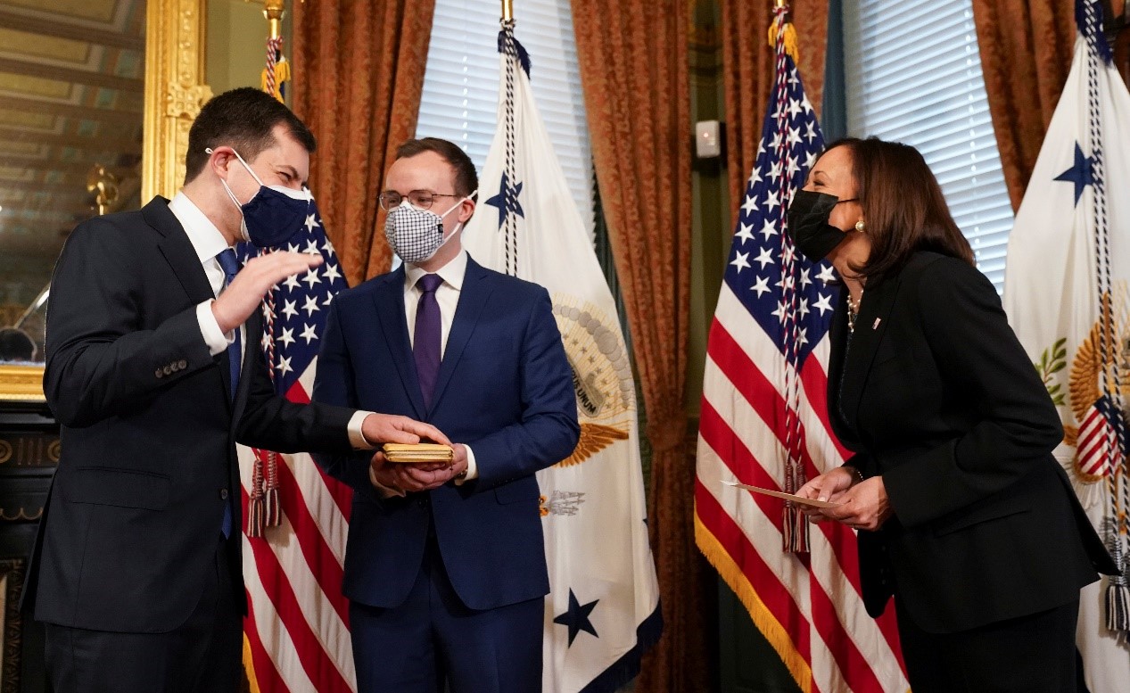 當地時間2月3日,在美國華盛頓白宮,新任交通部長布提吉格在美國副總統賀錦麗的見證下宣誓就職。為布提吉格手捧《聖經》的是他的丈夫查斯滕。布提吉格是美國歷史上第一位公開同性戀身份的內閣成員。