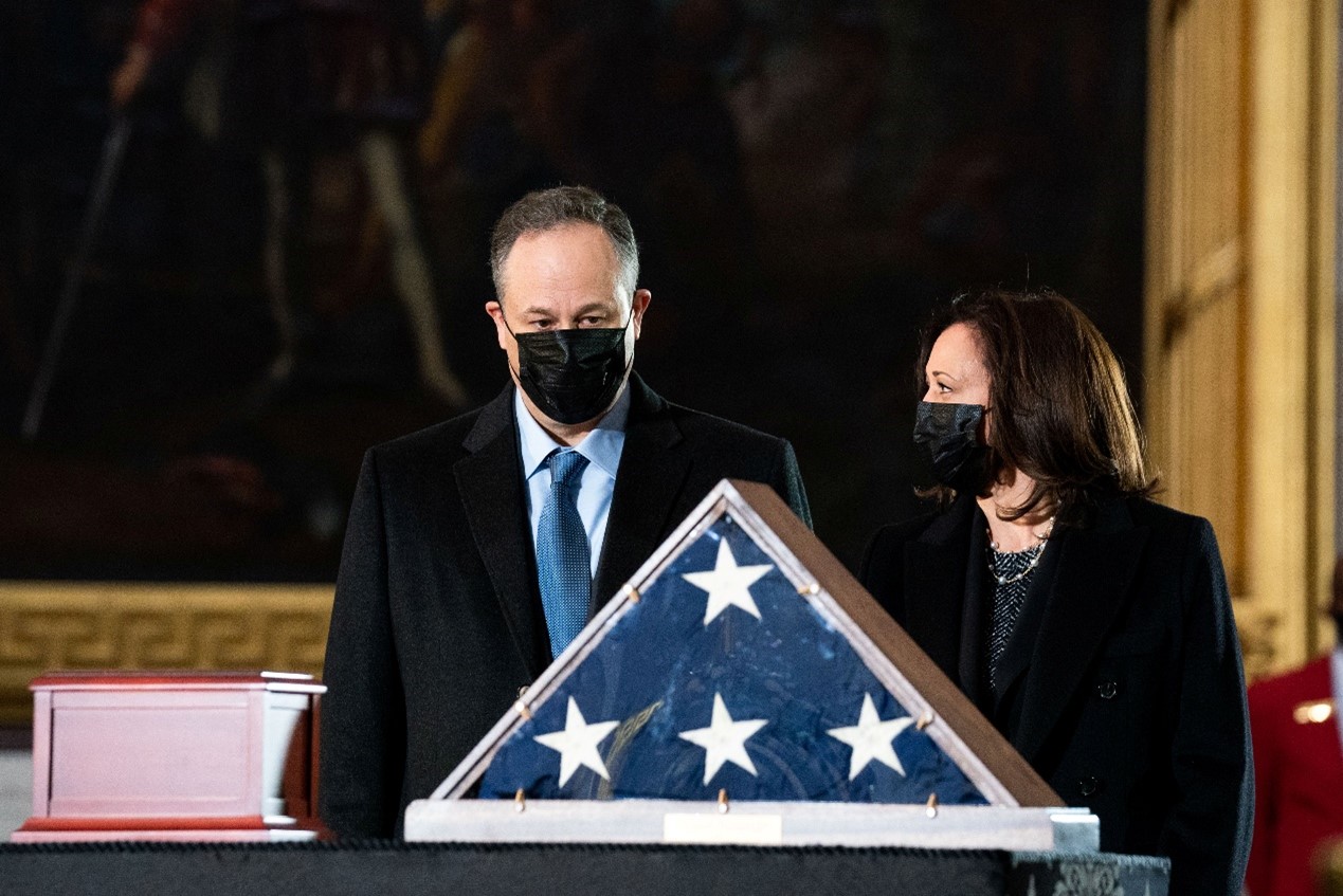 當地時間2月3日,在美國華盛頓國會大廈,美國副總統賀錦麗和第二先生任德龍向在1月6日國會騷亂中去世的警察斯尼克致敬。