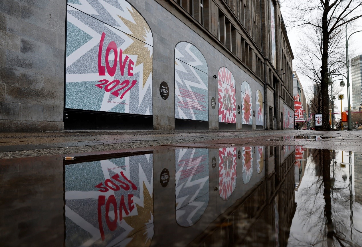 當地時間2月3日,德國柏林一家百貨公司的窗戶倒映在水中。因疫情封禁關係,路上行人不多。