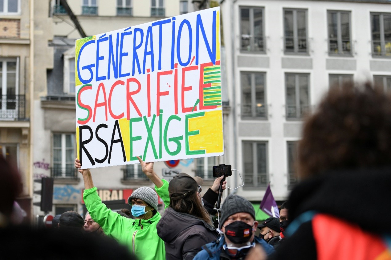 當地時間2月4日,法國一名抗議者參加全國罷工活動,抗議裁員及政府在新冠大爆發期間的經濟和社會政策。