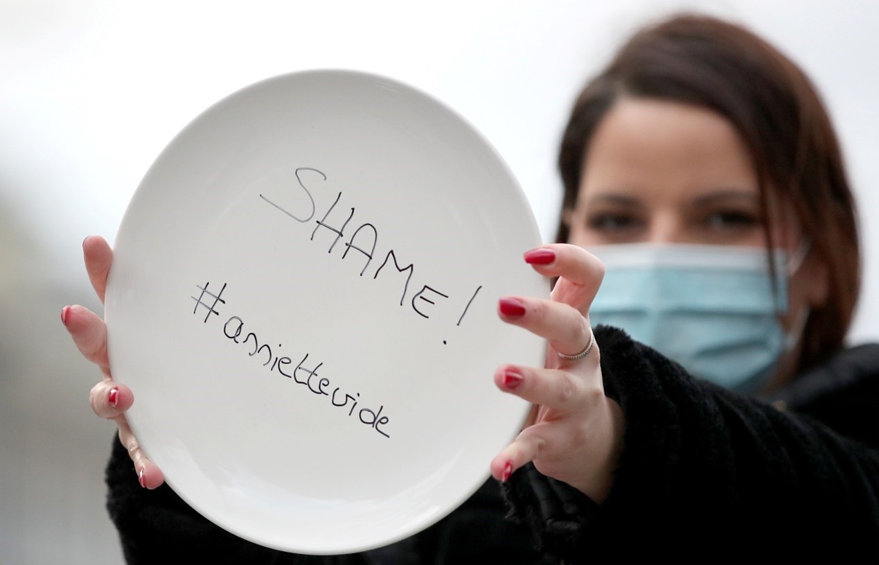 當地時間2月5日,比利時一名餐館老闆拿著印有#assiettevide(空盤子)標籤的餐盤,抗疫政府因疫情下令關閉比利時酒吧和餐館的舉措。
