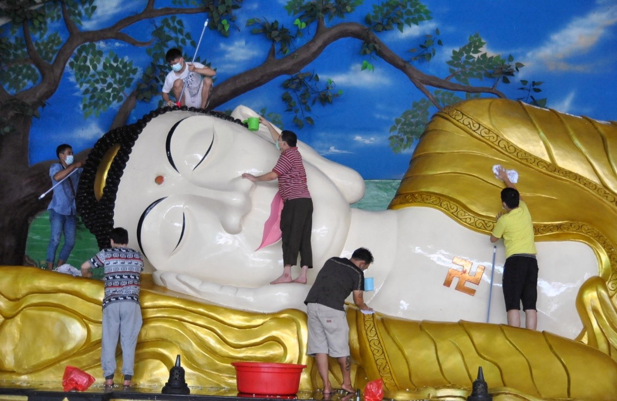 當地時間2月7日,印尼西爪哇省茂物市,工人們在中國農曆新年慶祝活動前清理寺廟中的巨大佛像。