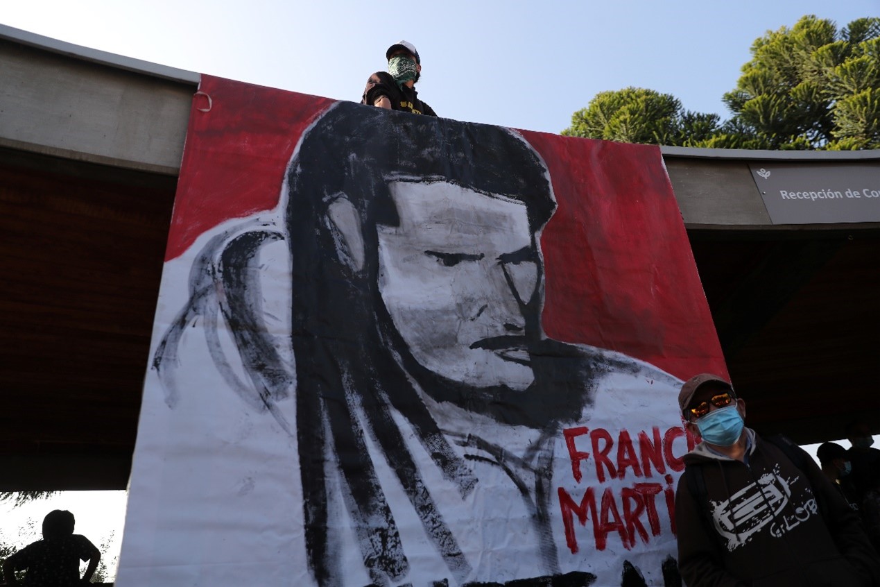 當地時間2月8日,在智利聖地亞哥,有人掛起一副被員警槍殺的街頭雜耍藝人馬丁內斯的畫像。因馬丁內斯表演時沒有按要求提供身份證明,因而發生口角。員警先後他腳部及胸部開槍。