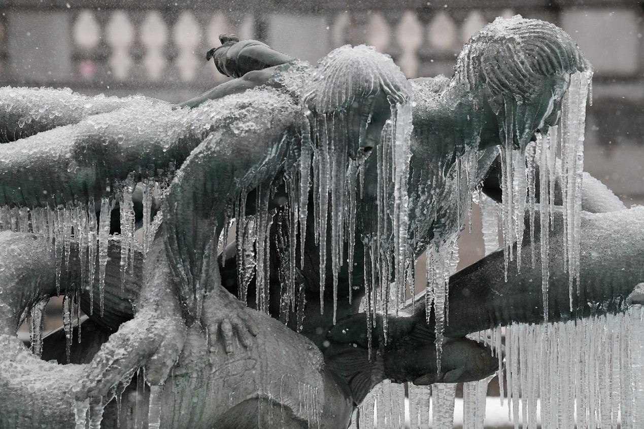 當地時間2月9日,風暴「達西」侵襲英國倫敦,特拉法加廣場一座噴泉被冰柱覆蓋。