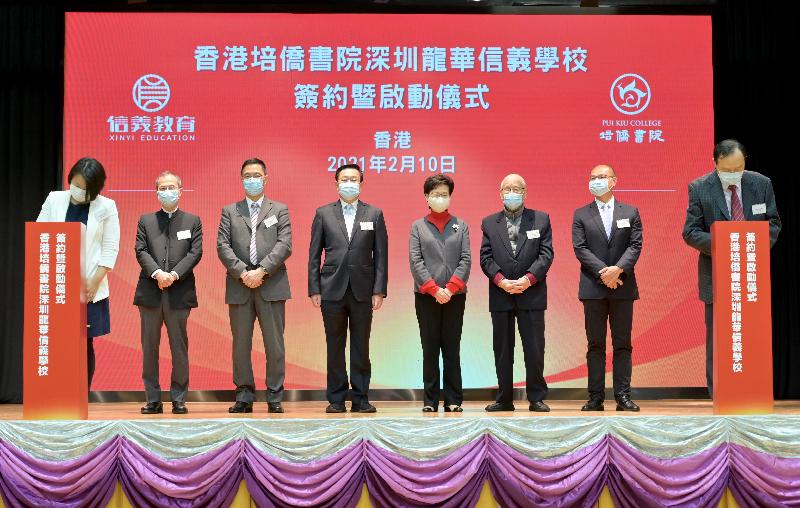 林鄭月娥續指,這個計劃得以順利開展,有賴多方的鼎力支持。特區政府非常感謝深圳市委、市政府相關部門的積極推動和配合,和中聯辦提供的協助。由培僑教育機構於2020年3月正式向深圳市人民政府提出申請,至深圳市龍華區人民政府、香港培僑書院、深圳市信義控股集團有限公司三方於去年七月以「雲上簽約」簽署戰略合作備忘錄,體現了在疫情之中各方付出的努力,讓辦學的計劃可以盡早開展;而我亦已經要求特區政府教育局為學校提供一切所需的支持。
