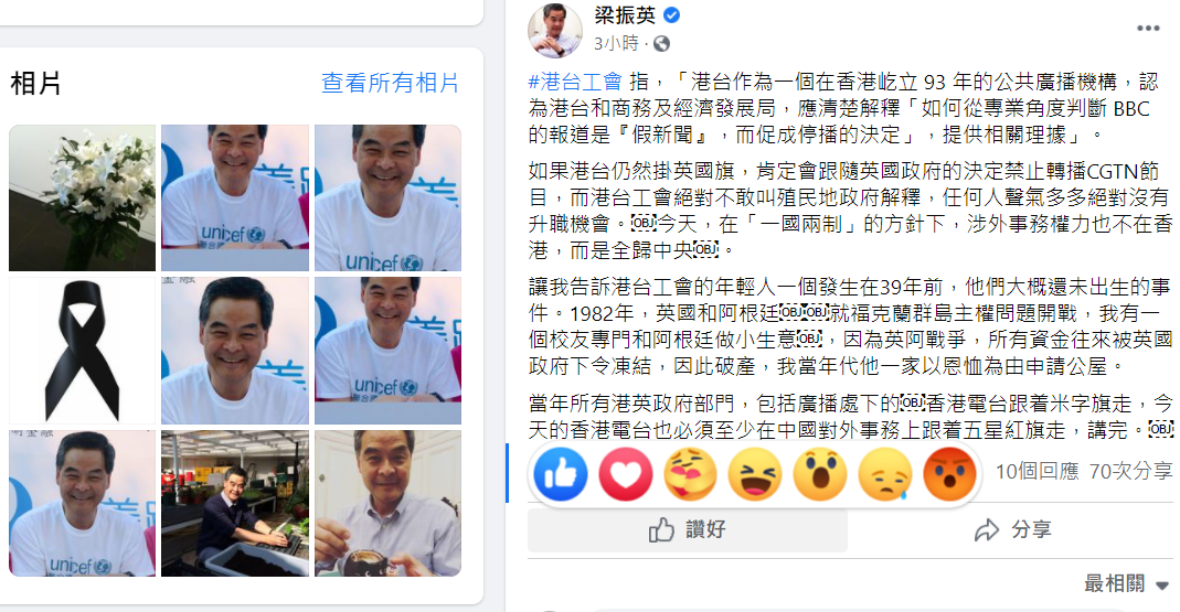 梁振英指出,讓我告訴港台工會的年輕人一個發生在39年前,他們大概還未出生的事件。1982年,英國和阿根廷就福克蘭群島主權問題開戰,我有一個校友專門和阿根廷做小生意,因為英阿戰爭,所有資金往來被英國政府下令凍結,因此破產,我當年代他一家以恩恤為由申請公屋。