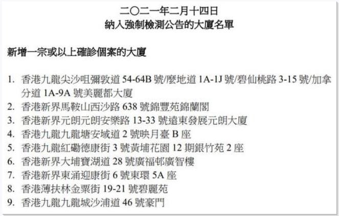 政府昨晚(12日)刊憲,將9幢樓宇納入強制檢測公告。涉及樓宇包括尖沙咀美麗都大廈、馬鞍山錦豐苑錦蘭閣、元朗安樂路遠東發展元朗大廈、九龍塘映月臺B座、黃埔花園12期銀竹苑2座、大埔廣福邨廣智樓,東涌東環一期5A座、薄扶林金粟街碧麗苑和九龍城沙浦道豪門。