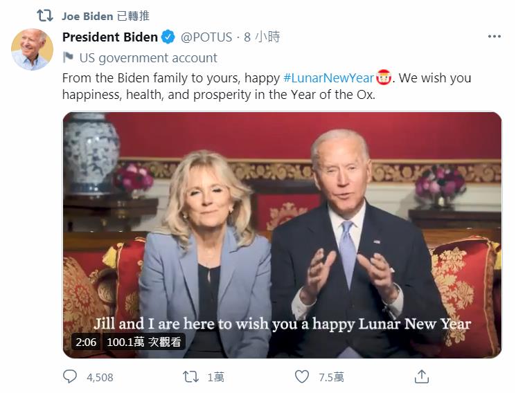 当地时间2月12日(农历大年初一),美国总统拜登与第一夫人吉尔在社交媒体上发表视频,送上春节祝福。他们祝愿每一位庆祝春节的人节日快乐,并表示这是一个辞旧迎新的时刻,也是一个庆祝的时刻,对很多美国人来说,从来没有像这样现在这样需要一个新的开始。针对种族主义、骚扰和仇恨,拜登表示,「这是完全错误的。每一个人,无论他们的种族、背景、宗教或者他们所说的语言是什么,都应得到平等的待遇和应有的尊严」
