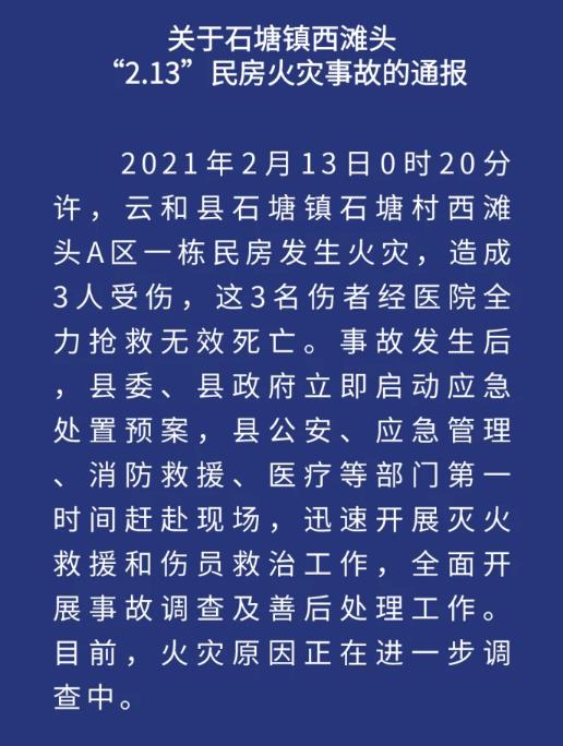 2月13日0時20分許,雲和縣石塘鎮石塘村西灘頭A區一棟民房發生火災,造成3人受傷,這3名傷者經醫院全力搶救無效死亡。目前,火已被撲滅,未波及周邊建築。
