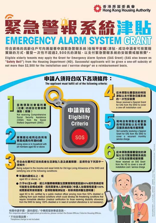 發言人解釋:「隨着科技迅速發展,流動裝置更趨普及,『緊急警報系統』產品種類亦多樣化,例如流動電話及智能電話應用程式,故房委會優化『緊急警報系統津貼』,容納不同的流動裝置,以及相關的服務費。把津貼範圍涵蓋至適用於流動裝置,對於一些不想採用固網電話線的長者住戶來說尤其受歡迎。」