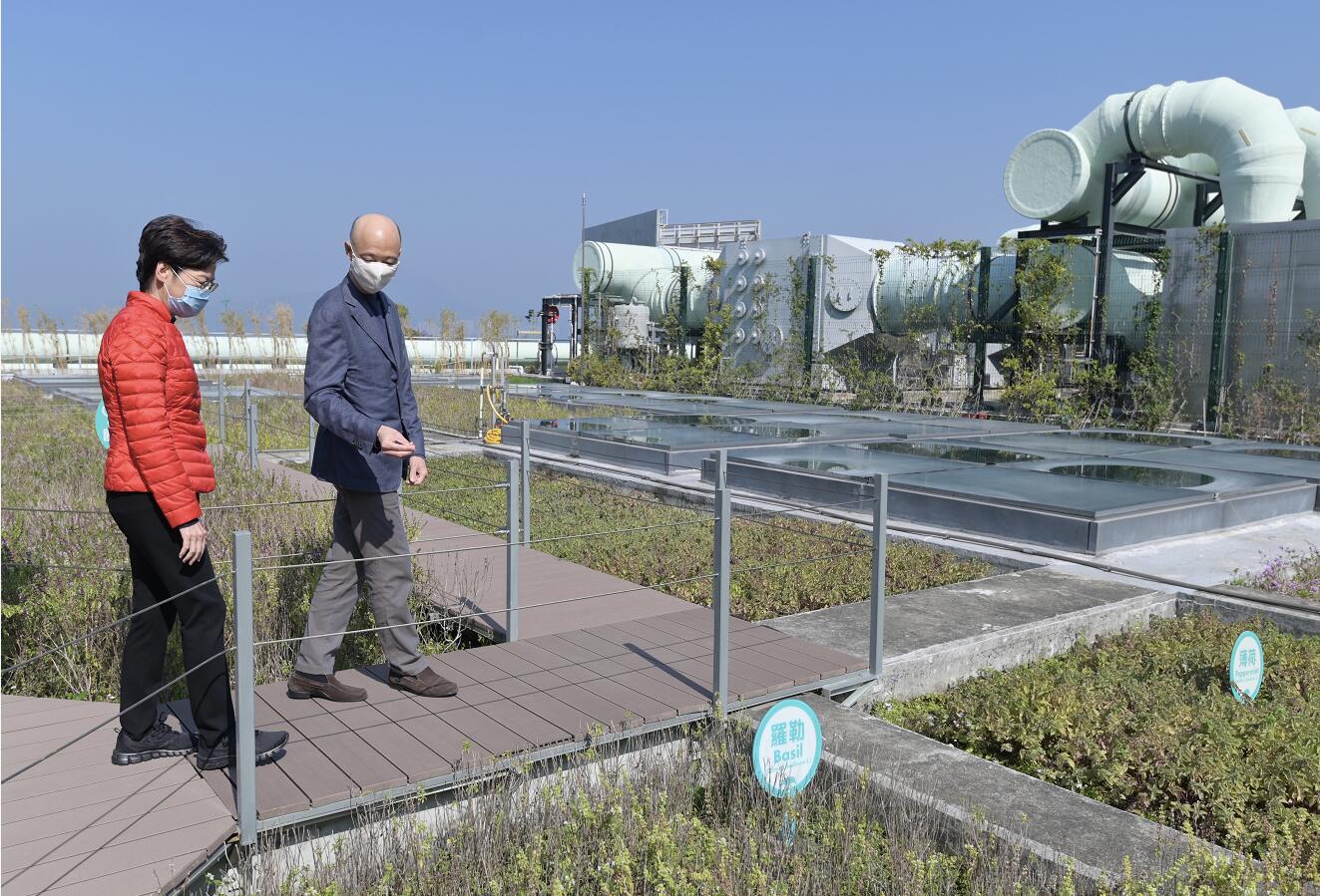 行政長官林鄭月娥(左)今日(二月十五日)在環境局局長黃錦星(右)陪同下到訪位於大嶼山小蠔灣的O.PARK1。