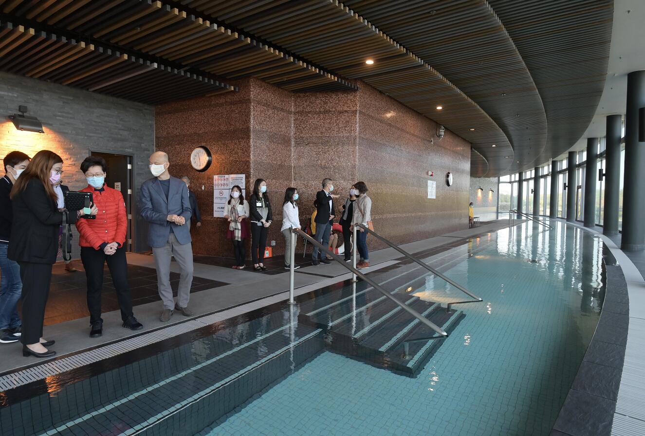 行政長官林鄭月娥(左三)今日(二月十五日)在環境局局長黃錦星(左四)陪同下到訪屯門的 T.PARK[源.區],聽取環境保護署人員介紹以焚化污泥過程中產生的熱能加熱的水療池。