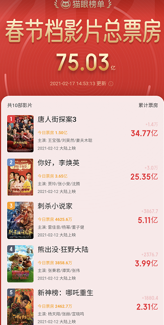 據貓眼專業版數據,2021年春節檔影片總票房超75億元,其中《唐人街探案3》和《你好,李煥英》票房分別超34億元和25億元。