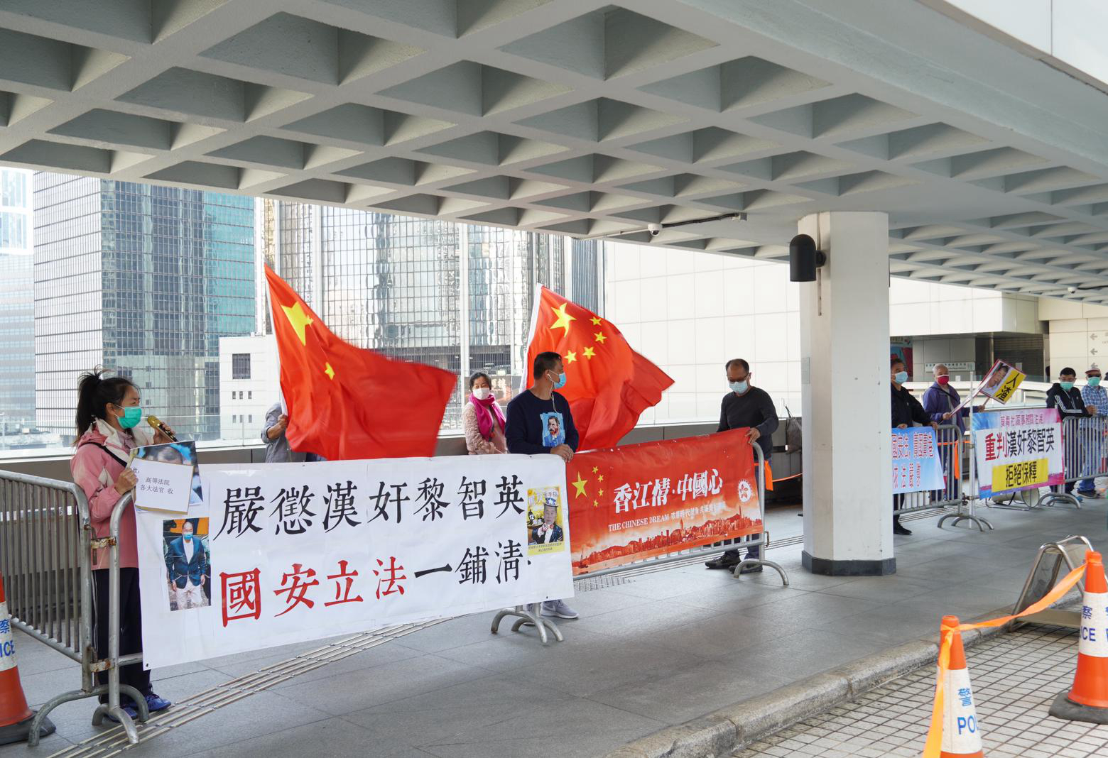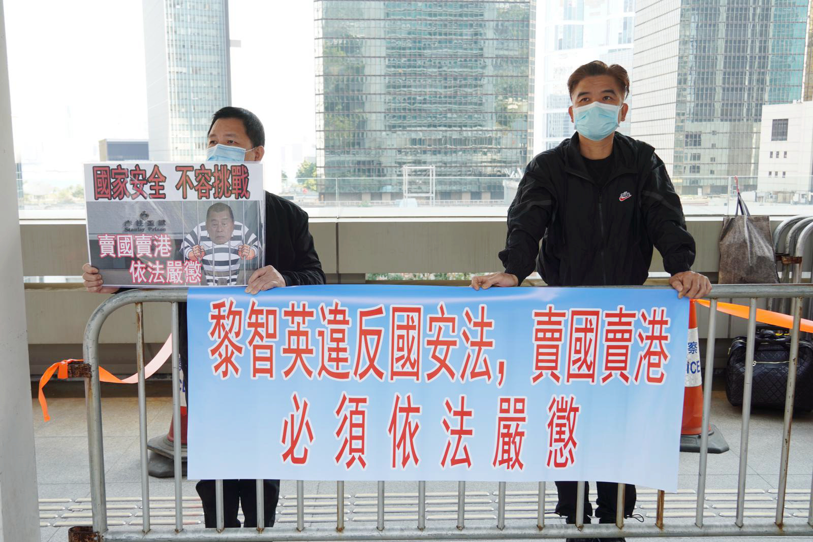 反中亂港頭目黎智英就違反香港國安法案,今天(18日)再向高等法院申請保釋。多個團體在法院門口高舉「打倒漢奸、賣國賊」等橫額請願,要求嚴懲黎智英。