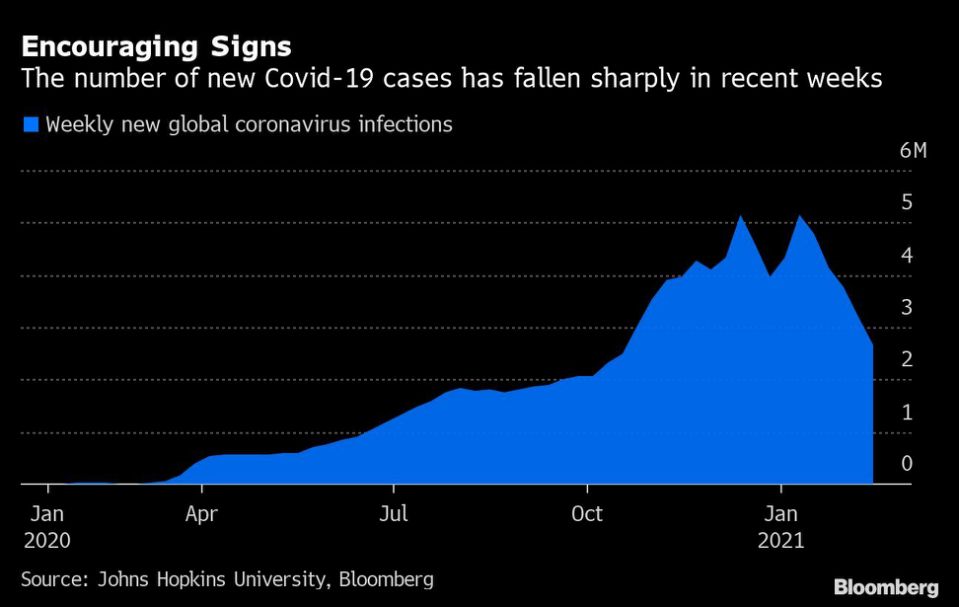 據約翰斯·霍普金斯大學的數據,截至2月14日的一周,全球新增新冠確診病例為10月以來最少,為270萬例。這相當於累計確診病例比此前一周增加2.5%,是疫情開始以來的最小增幅,也是一個月前增幅的不到一半水平。