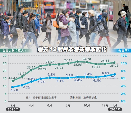 政府統計處18日公布,去年11月至今年1月經季節性調整的失業率急升至7%,較去年10月至12月的6.6%上升0.4個百分點;就業不足率亦由3.4%上升0.4個百分點,至3.8%。失業及就業不足人數均上升,分別增加7500人及14400人,升至25.33萬及14.82萬人。分析稱,雖然防疫措施18日起放寬,但就業市場呈滯後狀態,預料失業率到下半年才會明顯回落。