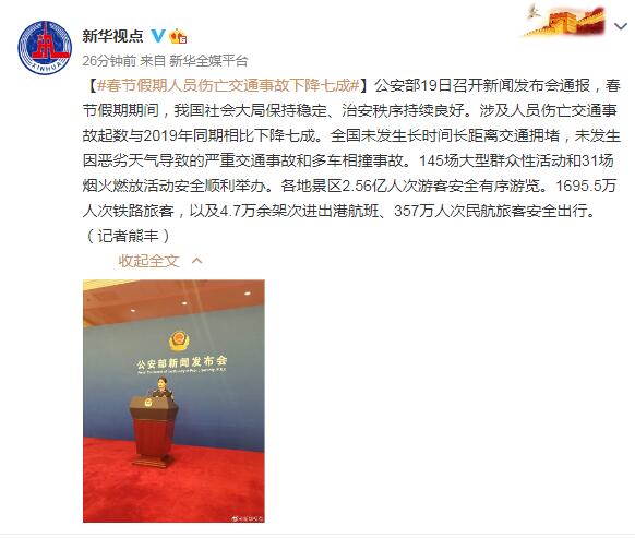 據新華視點微博消息,公安部19日召開新聞發布會通報,春節假期期間,中國社會大局保持穩定、治安秩序持續良好。涉及人員傷亡交通事故起數與2019年同期相比下降七成。全國未發生長時間長距離交通擁堵,未發生因惡劣天氣導致的嚴重交通事故和多車相撞事故。145場大型群眾性活動和31場煙火燃放活動安全順利舉辦。各地景區2.56億人次遊客安全有序遊覽。1695.5萬人次鐵路旅客,以及4.7萬餘架次進出港航班、357萬人次民航旅客安全出行。