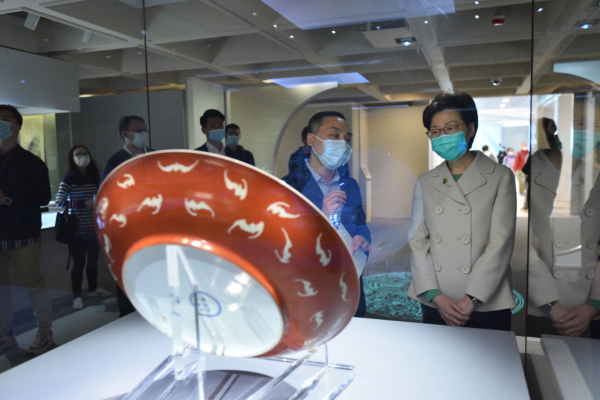 行政長官林鄭月娥今日(19日)下午到訪於19日重新向公眾開放的香港藝術館和香港文化中心,視察防疫措施,並參觀香港藝術館正舉行的專題展覽和探訪正在香港文化中心音樂廳進行綵排之香港管弦樂團。