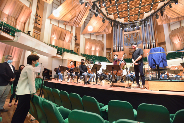 林鄭月娥觀看了香港管弦樂團正進行的綵排,並為團員打氣、與指揮廖國敏和大提琴家李垂誼交流;林鄭月娥知道樂團為再次演出作出很多努力,她相信在新冠肺炎疫情緩和後,樂團會逐步恢復在本港和海內外各地的演出。