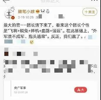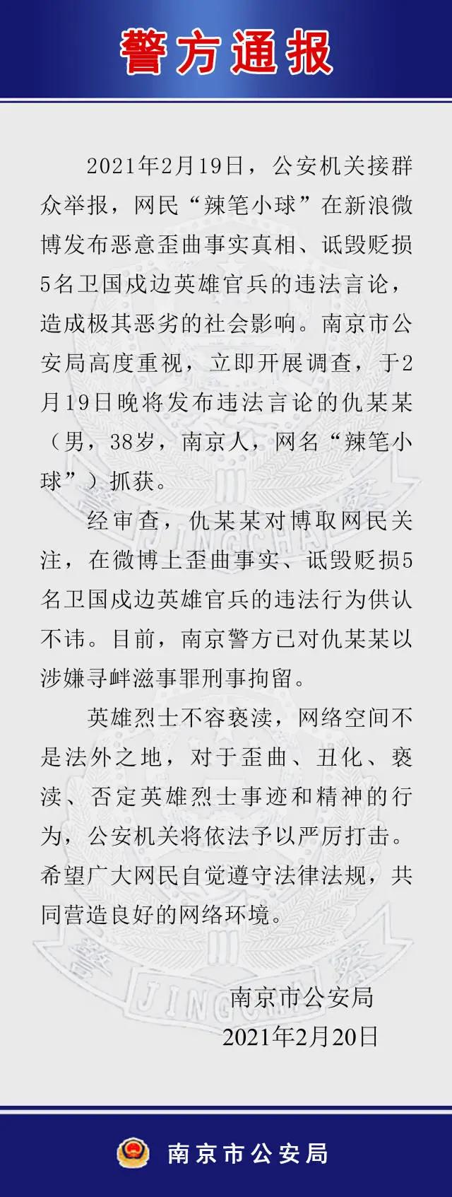 據南方日報報道,2月19日,南京警方通報,公安機關接到群眾舉報,網民「辣筆小球」在新浪微博惡意歪曲事實真相、詆毀貶損5名衛國戍邊英雄官兵的違法言論,造成極其惡劣的社會影響。南京公安局高度重視,立即開展調查,於2月19日晚將發布違法言論的仇某某(男,38歲,南京人,網名「辣筆小球」)抓獲。