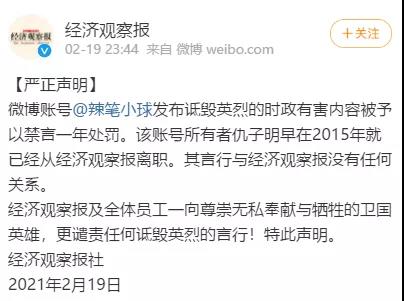 2月19日晚間,《經濟觀察報》在其官方微博發布嚴正聲明稱,該賬號所有者仇子明早在2015年就已經從經濟觀察報離職。其言行與經濟觀察報沒有任何關係。