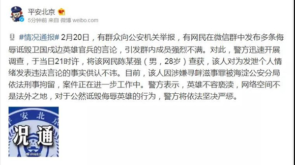據平安北京消息,2月20日,有群眾向公安機關舉報,有網民在微信群中發布多條侮辱詆毀衛國戍邊英雄官兵的言論,引發群內成員強烈不滿。對此,警方迅速開展調查,于當日21時許,將該網民陳某強(男,28歲)查獲,該人對為發泄個人情緒發表違法言論的事實供認不諱。目前,該人因涉嫌尋釁滋事罪被海淀公安分局依法刑事拘留,案件正在進一步工作中。警方表示,英雄不容褻瀆,網絡空間不是法外之地,對於公然詆毀侮辱英雄的行為,警方將依法堅決嚴懲。